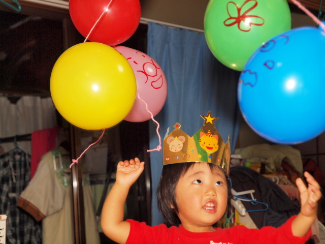100均でなぜか線香を購入(いや、僕の座禅のために・・・)、いやいや風船を大量に購入するなどし、妻けろりーなが飾り付け担当、僕が保育園に迎えに行きつつたっぷり遊んで帰ってくる担当、としました。
