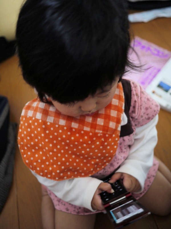 父の携帯をいじるけろ子氏(1歳) 知らんうちにお祖母ちゃんに電話かけてた。