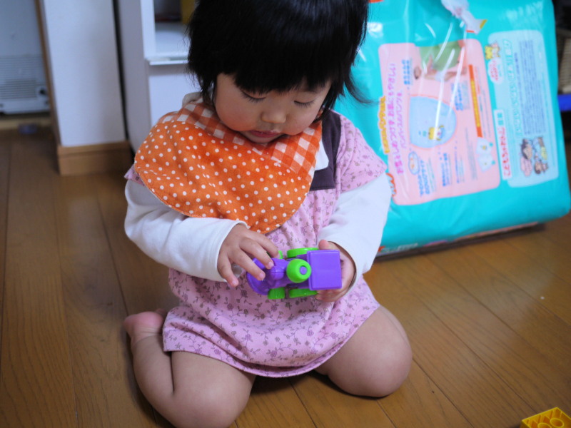 積み木と電車遊びに興じる けろ子氏(1歳)
