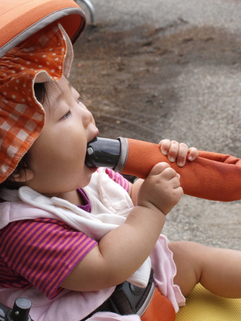 ちちうえ~ 私なんかベビーカーを頬張ってるのよ♪